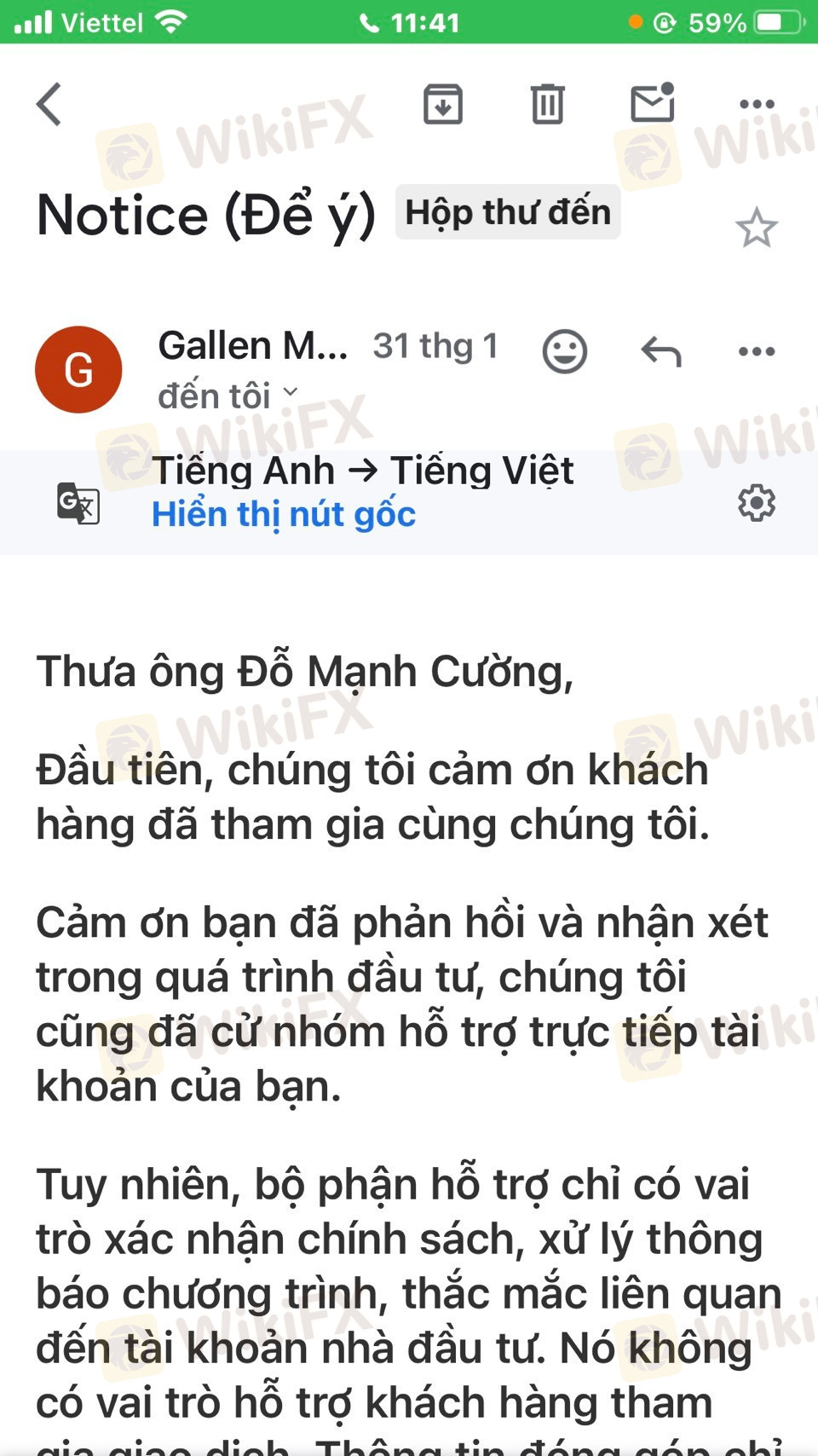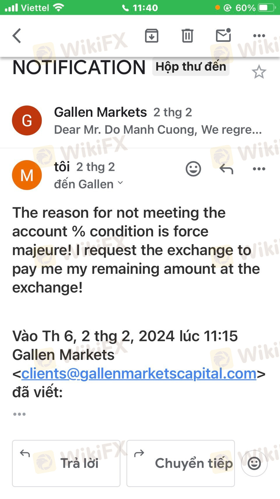 Ngày 16/1/2024 tôi có một tư vấn tự do giới thiệu vào tham gia sàn Gallen Capital , tôi thấy tên sàn của Thuỵ Sỹ nên cũng yên tâm tham gia , đầu tiên tôi vào 100 đô để thử xem nạp rút có được nhanh không , sau đó có rút thử ra 50 đô thì mọi việc diễn ra nhanh và bình thường mặc dù phí nạp rút rất cao so với các sàn khác , nạp vào 24500 thì nhận được 100 đô , nhưng rút 1000 đô thì chỉ nhận lại 23700 , tức là phí nạp rút là 800.000 vnd/1000 usd , sàn có giải thích là bên ngân hàng họ thu thế ( Ngân hàng MSB ) người nhận là Công Ty Thương Mại Toàn Cầu . Tiếp theo tôi có vào 2000 usd để tiếp tục giao dịch , sau khi tôi vào 2000 usd thì có người tên Khánh ( Số dt 076-2258504) có liên lạc với tôi nói là phụ trách quỹ của sàn và mời tôi tham gia gói 15000 usd để nhận các ưu đâi cua sàn , Khánh có gọi cho tôi rất nhiều để bảo tôi vào gói 15000 nói rằng gói này lâu lắm mới có và rất nhiều người muốn nhận được gói này , nếu không tham gia ngay thì sẽ mất cơ hội tốt này , sau đó tôi có nói chuyện lại với Thiện , thì Thiện bảo sẽ tham gia cùng với tôi khoảng 6000 đô . Sau đó tôi có chuyển vào tài khoản của sàn 193 triệu và báo với Thiện vào nốt số tiền thì Thiện lý do là chưa xoay được tiền . Tôi báo lại với sàn thì sàn bắt tôi phải vào đủ số tiền 15 ngàn , tôi nói tôi không còn dủ tiền để vào nữa sàn không chịu và bắt tôi phải giao dịch cho đủ ký quỹ mới duyệt lệnh rút tiền , sau đó sàn chặn lệnh rút tiền cua tôi , tiếp theo thì thằng Khánh chuyển hồ sơ của tôi qua cho thằng David Trần để tiếp tục xử lý , thằng David Trần bảo tôi đi lệnh rất lớn với mục đích cho tôi mau cháy tài khoản , sau đó tôi không giao dịch nữa , tôi vào đăng ký rút tiền thì bị khoá cổng vào trang của sàn để rút tiền . Sau đó tôi có gọi lại cho thằng Khánh thì nó cứ bắt tôi phải giao dịch cho đủ ký quỹ nó mới duyệt lệnh rút tiền , tiếp đó có 1 thằng kết bạn và gửi tin nhắn nói là người của sàn tên Cường Phạm sẽ giúp tôi giao dịch tốt hơn , tôi giao dịch theo mã nó gợi ý là mã Wheat(CME), vừa vào 0,5 lot thì tài khoản bị âm 32500 đô và cháy tài khoản luôn . Tôi gửi kèm theo hình ảnh đây để mọi người xem . Đây là 1 sàn lừa đảo nếu ai còn giao dịch hoặc định đầu tư vào sàn này thì phải dừng lại ngay . Tôi rất tức vì đã bị bon nó lừa để đầu tư tiền vào đây , tôi viết bài này để mong cộng đồng mạng và nhà chức trách hãy bắt ngay bọn sàn Gallen Capital này .
