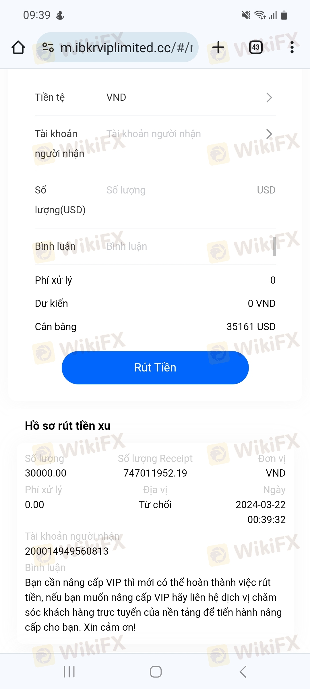 Tôi có đề nghị rút tiền đã nạp nhưng không được do sàn yêu cầu phải nâng cấp vip 3 tháng. Tôi đã nhắn hỏi cơ sở khách hàng cách rút tiền nhưng không được thông báo về vấn đề này.