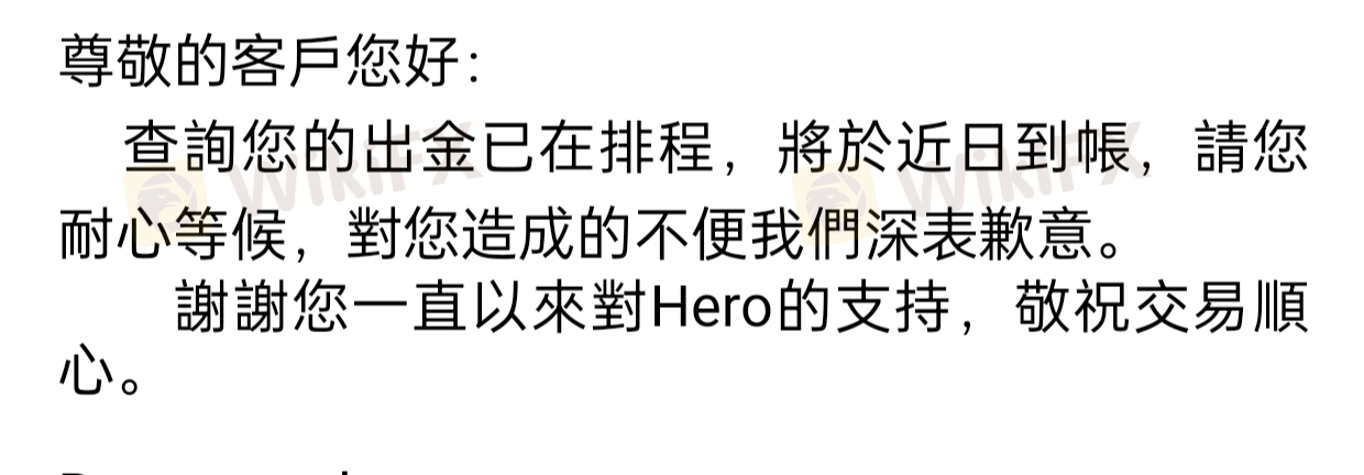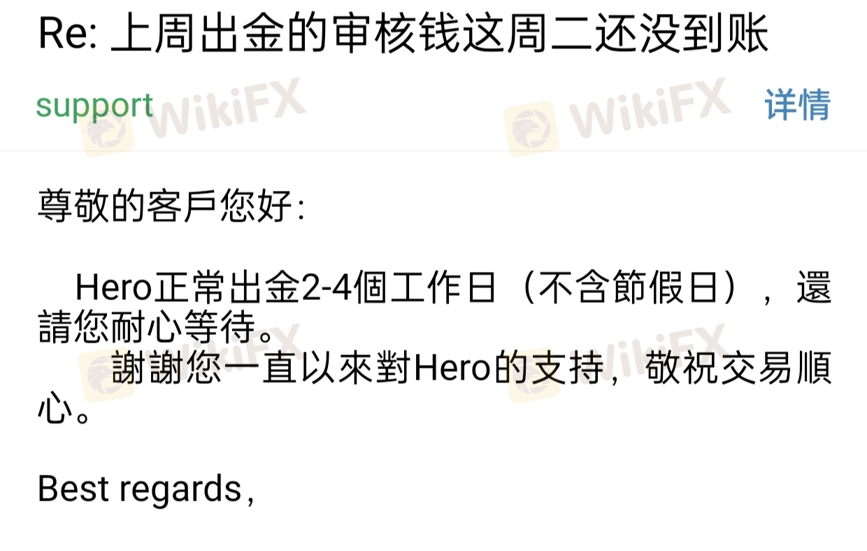 hero官方开始说二到四个工作日出金,结果超过四个工作日,发邮件到hero邮箱又改口说进日出金