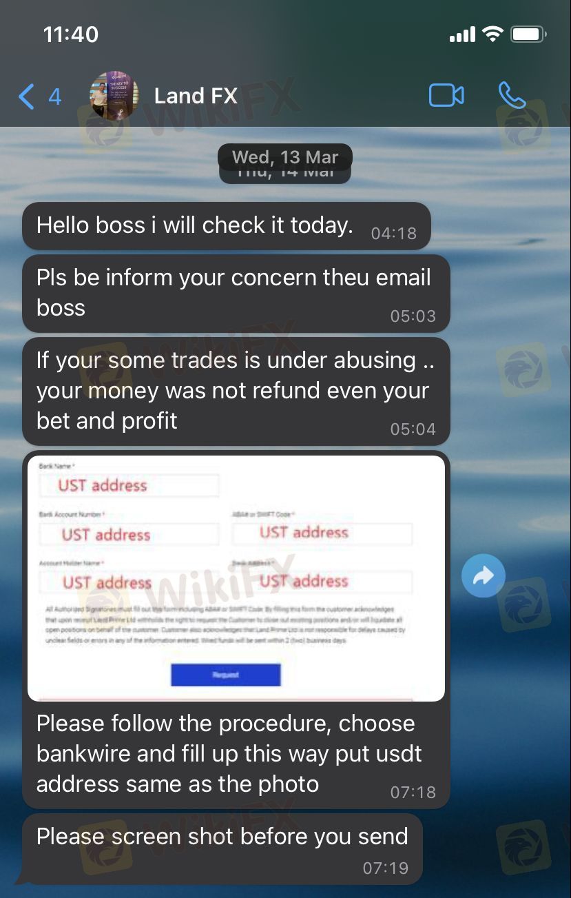 I worked with land fx company for about 1 month. When I wanted to withdraw money after this period, they kept my request waiting for a long time. And then they told me that I could not receive my profit, I could only receive my principal, and if I accepted this situation, I had to sign the document they sent. So I signed this document. And the WhatsApp support line told me that if I write my TRC20 address in the bank transfer section when withdrawing my main money, the money will reach me faster, but my money has still not reached me for more than 3 weeks and I cannot get any response from Land Fx company.