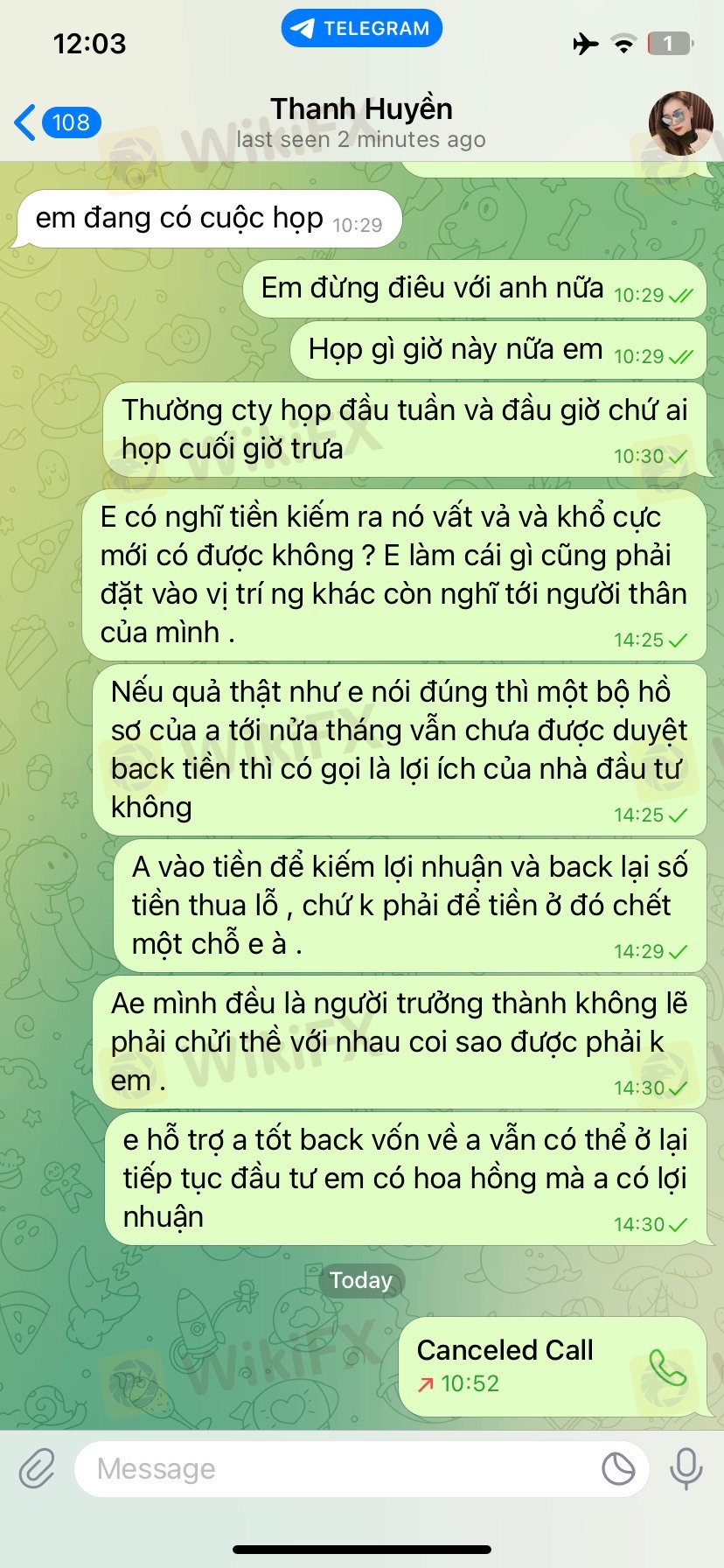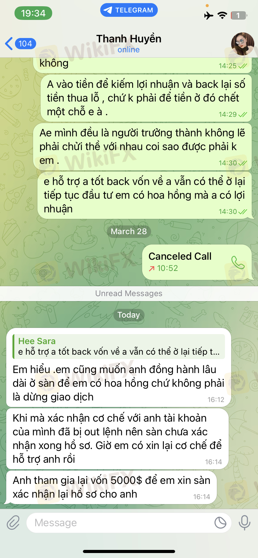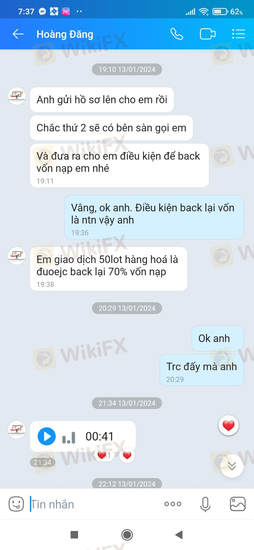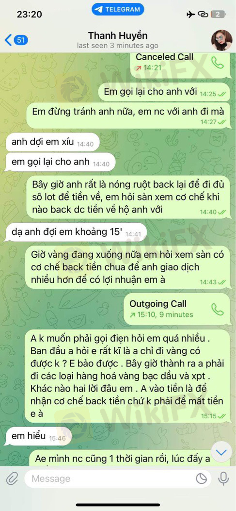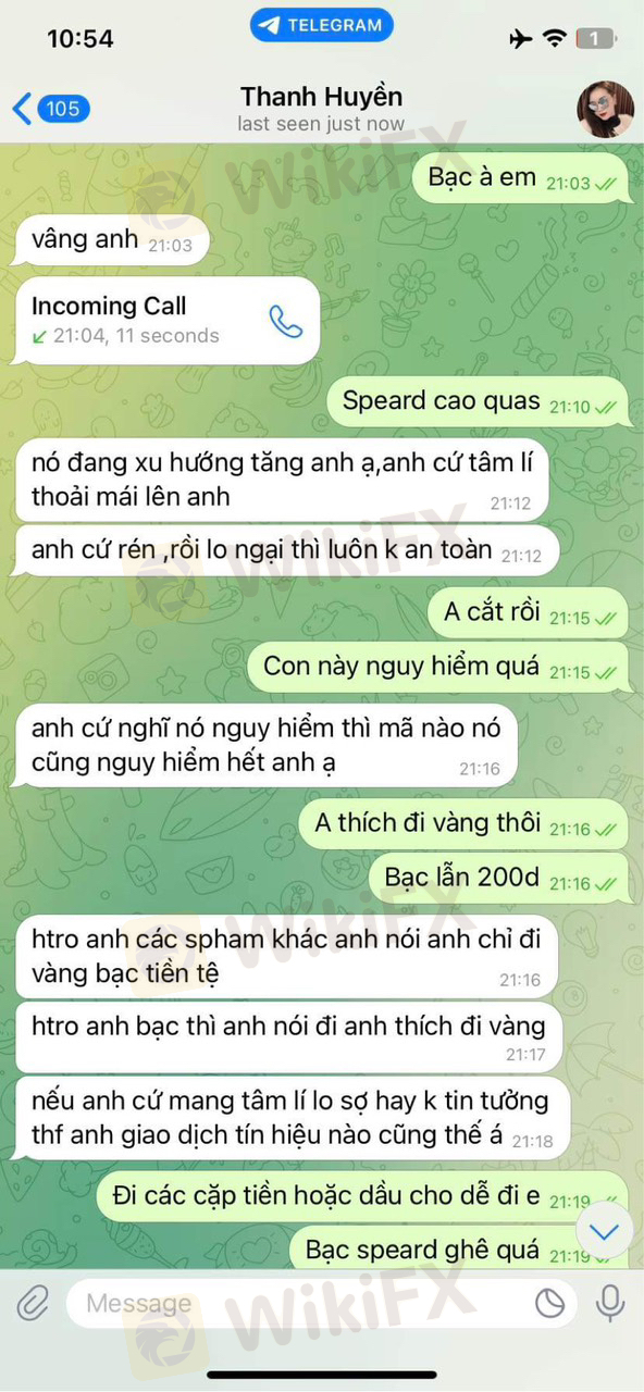 - Ban đầu Mình không làm theo vì mình đọc được rất bài viết tố cáo trên nhóm cộng đồng trader, cụ thể là đi 1 lot sẽ âm tài khoản đến 6000usd mình bảo với Thanh Huyền là Mình không muốn đi lệnh này, nhưng bạn Thanh Huyền nhất quyết bắt Mình làm theo và nói đây là yêu cầu của sàn. Bạn Thanh Huyền đảm bảo chắc chắn sẽ hoàn lại số tiền âm của lệnh buy XPTUSD. Vì tin tưởng vào sàn và người hỗ trợ nên Mình đã đi theo tín hiệu.