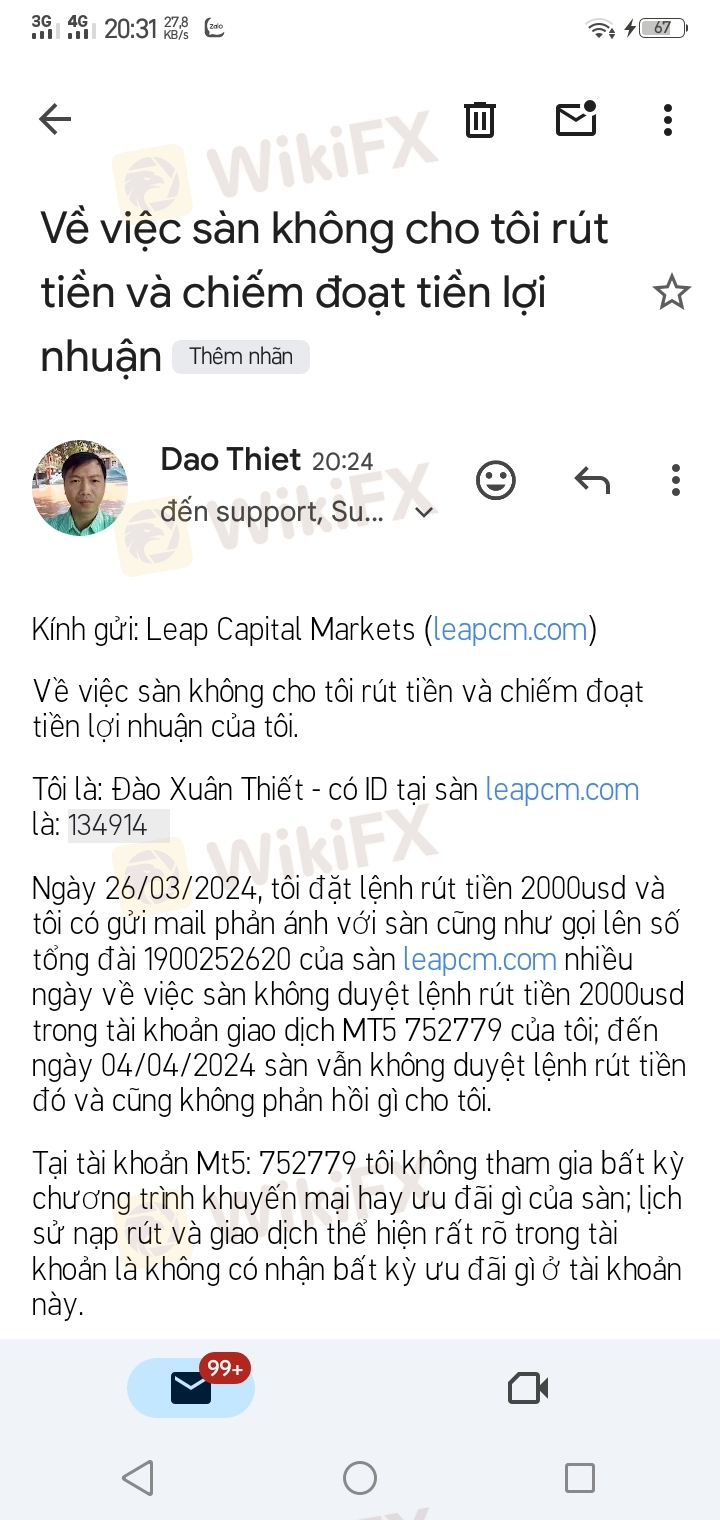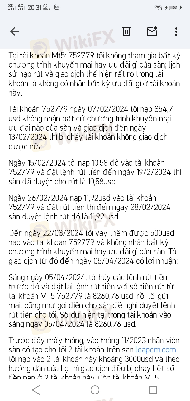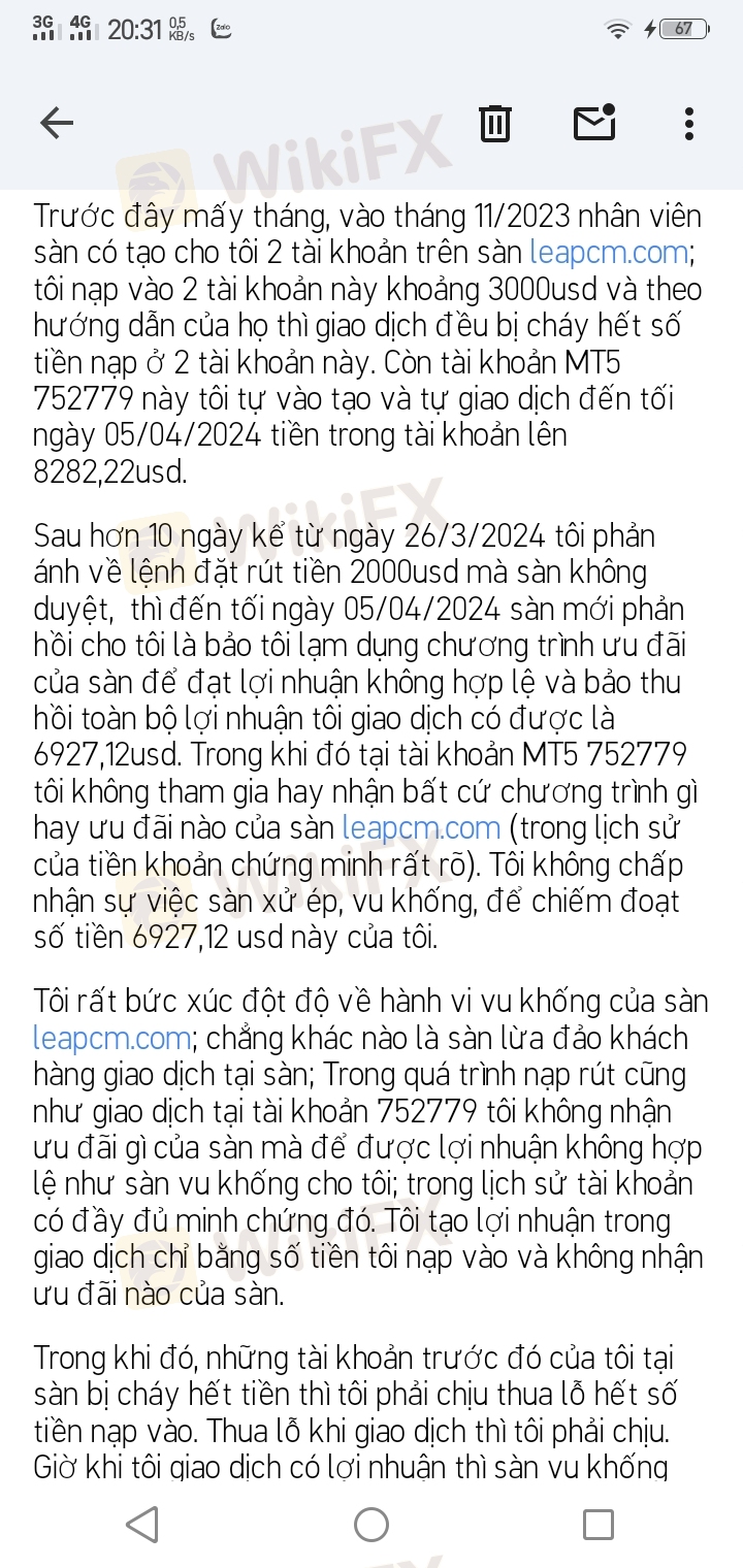 Sàn leap catital markets (leapcm.com) xử ép, vu khống, chiếm đoạt tiền của tôi là 6927,12usd