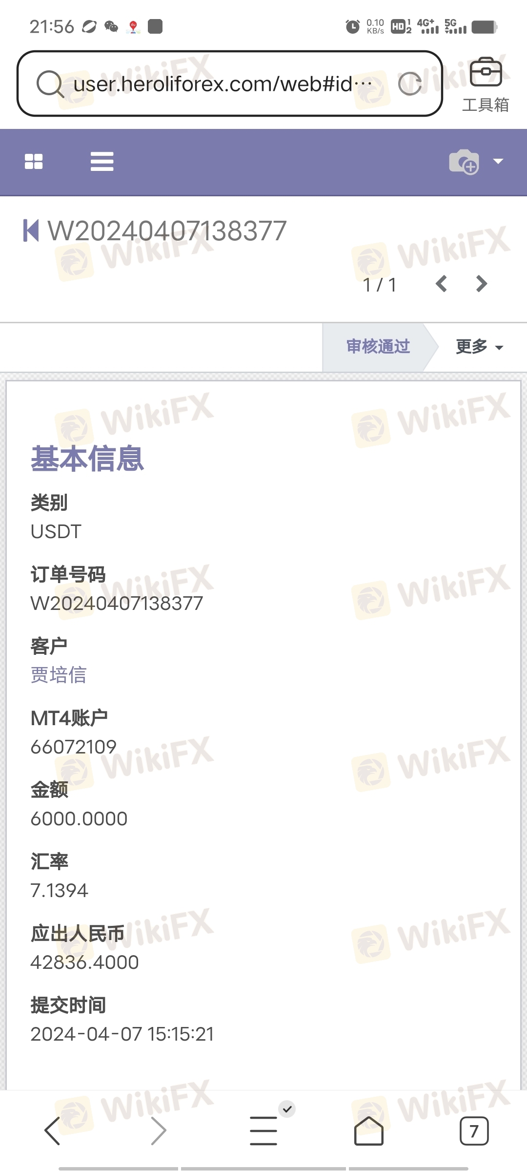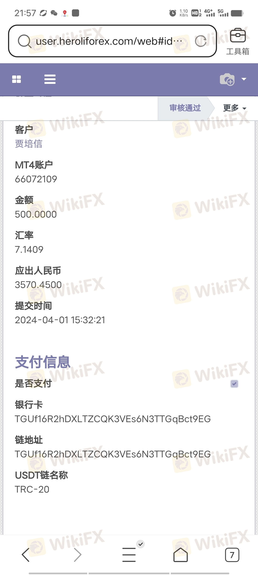 出金金额和信息按提示操作然后提交,过两到三天显示审核通过,但是一直到不了账
