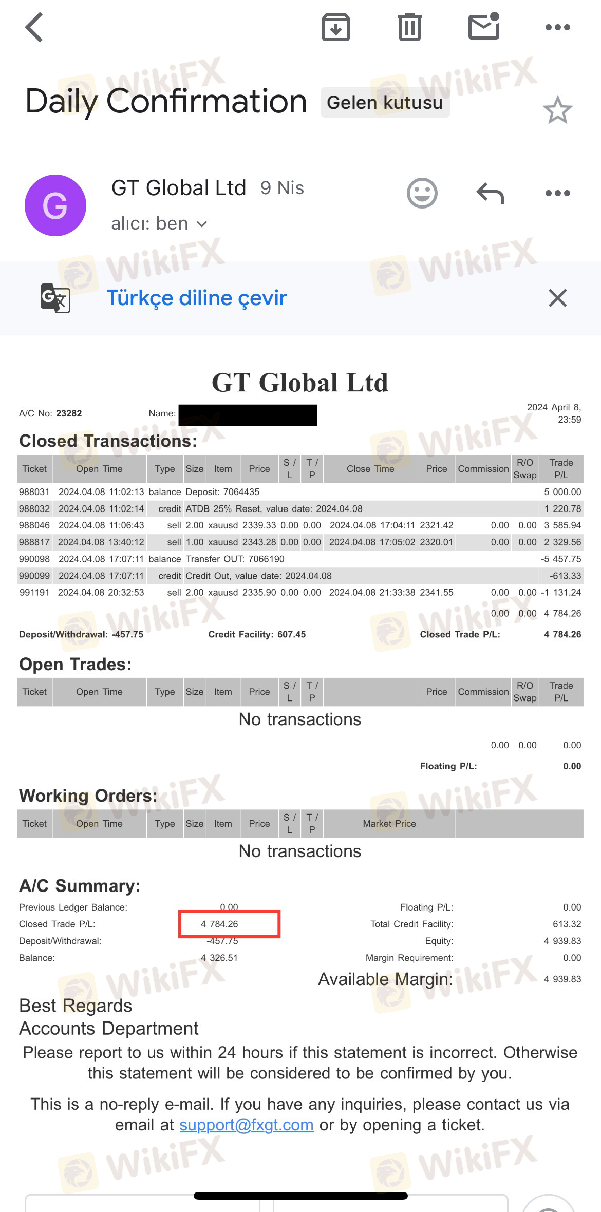 Before my last investment, on 08.04.2024, I lost my entire deposit while trading gold in the same way. Then I invested again and made a profit. When I wanted to withdraw money, they stamped bad faith. When I lose, I have good intentions, but when I win, can there be bad intentions? This company is malicious and when you earn a lot, they will prevent you and they will not pay you. Definitely stay away!!!