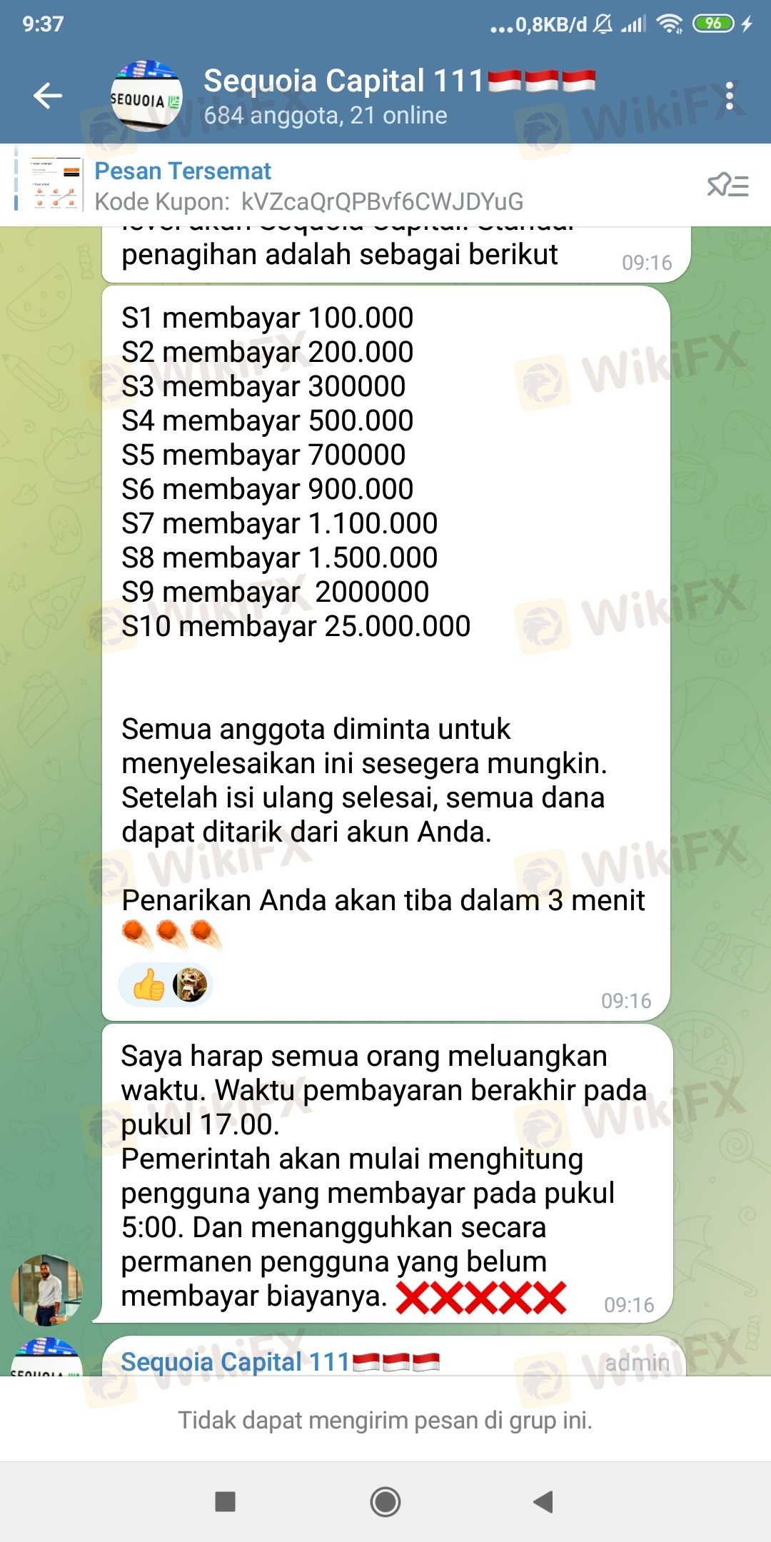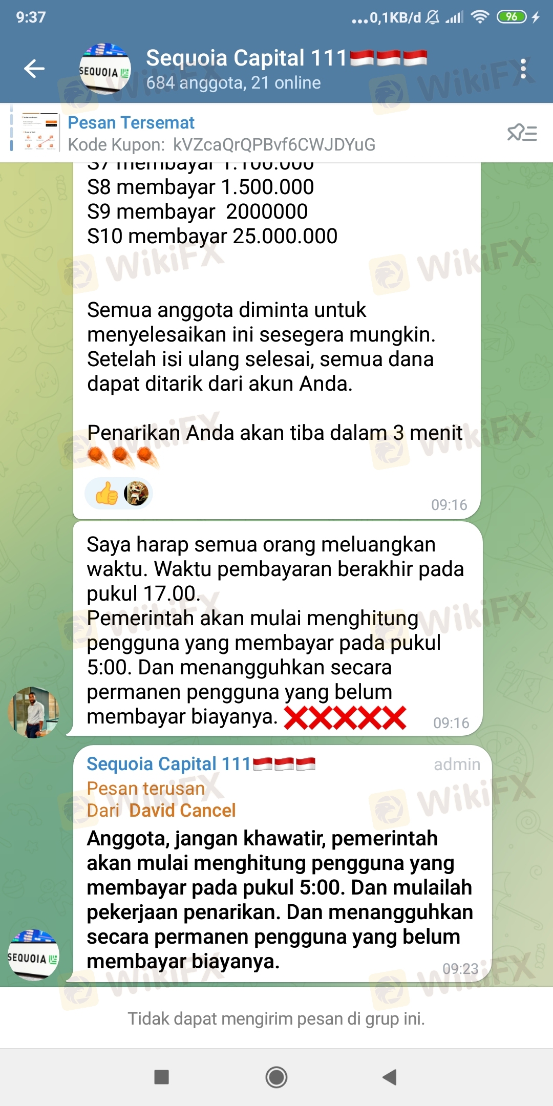 Janji pihak sequoia pada semua anggota yg katanya dapat melakukan penarikan pd hari ini tanggal 18 April 2024 ternyata palsu dan bohong!! dengan berbagai alasan dari a sd z itu hanya rekayasa mereka agar para anggota percaya, selain itu mereka membujuk pada semua anggota untuk melakukan top up lagi dg alasan tertentu agar uang investasinya tidak hilang dan bisa melakukan penarikan (WD).