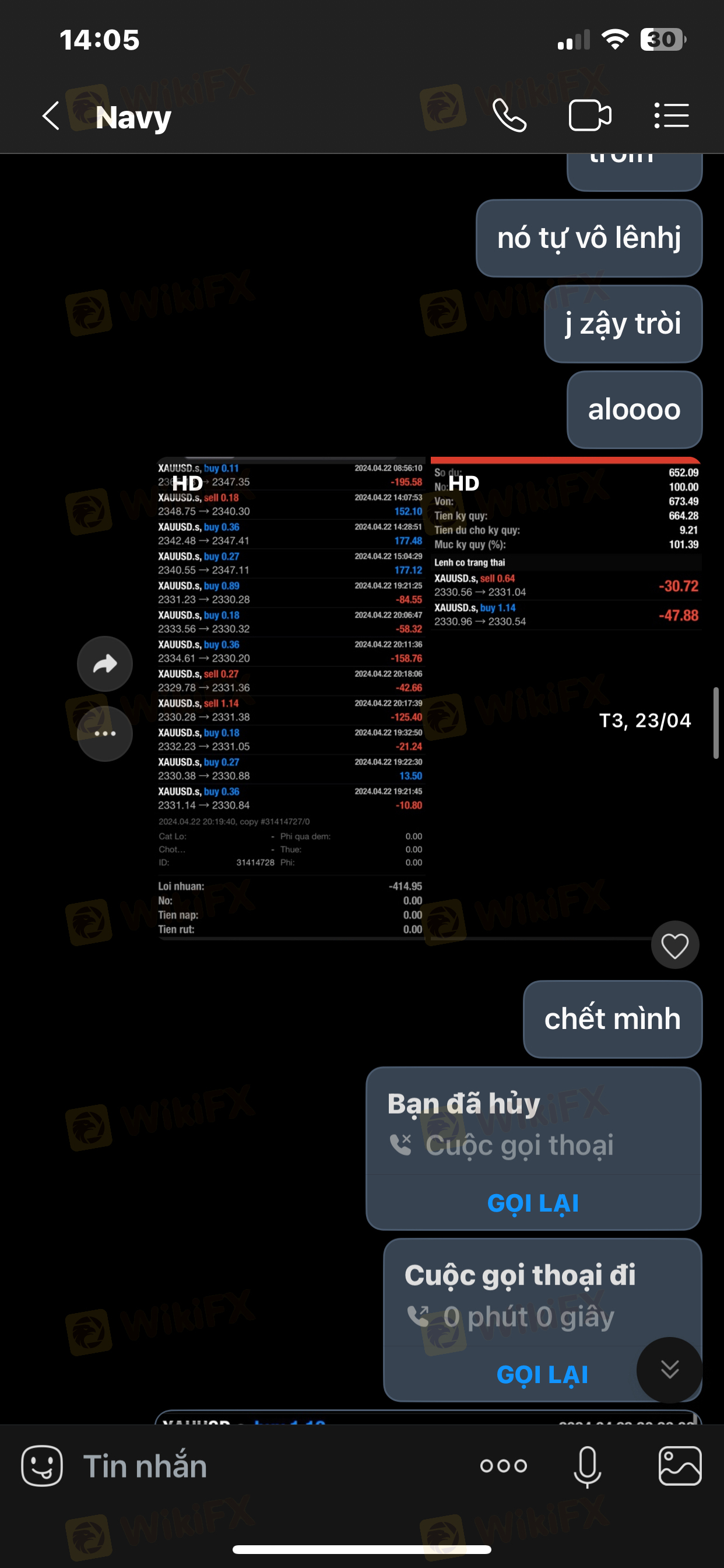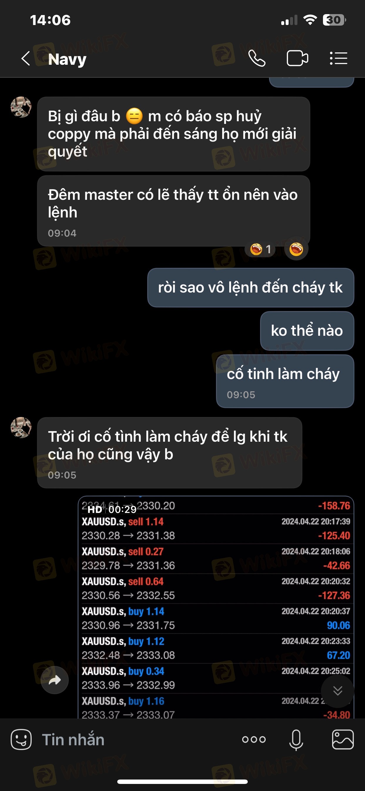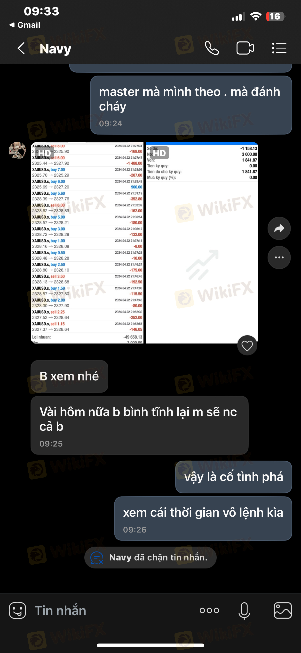 Tiếp theo là khuya hôm đó Master cố tình đánh nhồi lệnh TK mình. Mình nhấn mạnh cố tình vì SP có thể xem thời gian vô lệnh (1phút đặt 5lot). Mình có liên lạc với master khuya hôm đó và không nhận được phản hồi, đến qua sáng hôm sau ngày 23/4. Master đã phản hồi với 1 câu là vì mình rút vốn và master ko đồng ý và sau đó đã chặn mình.