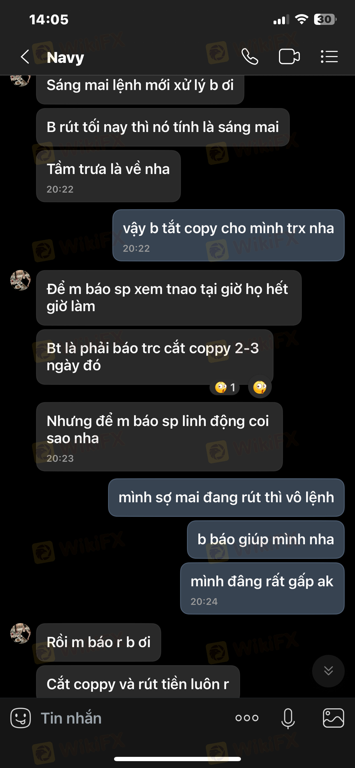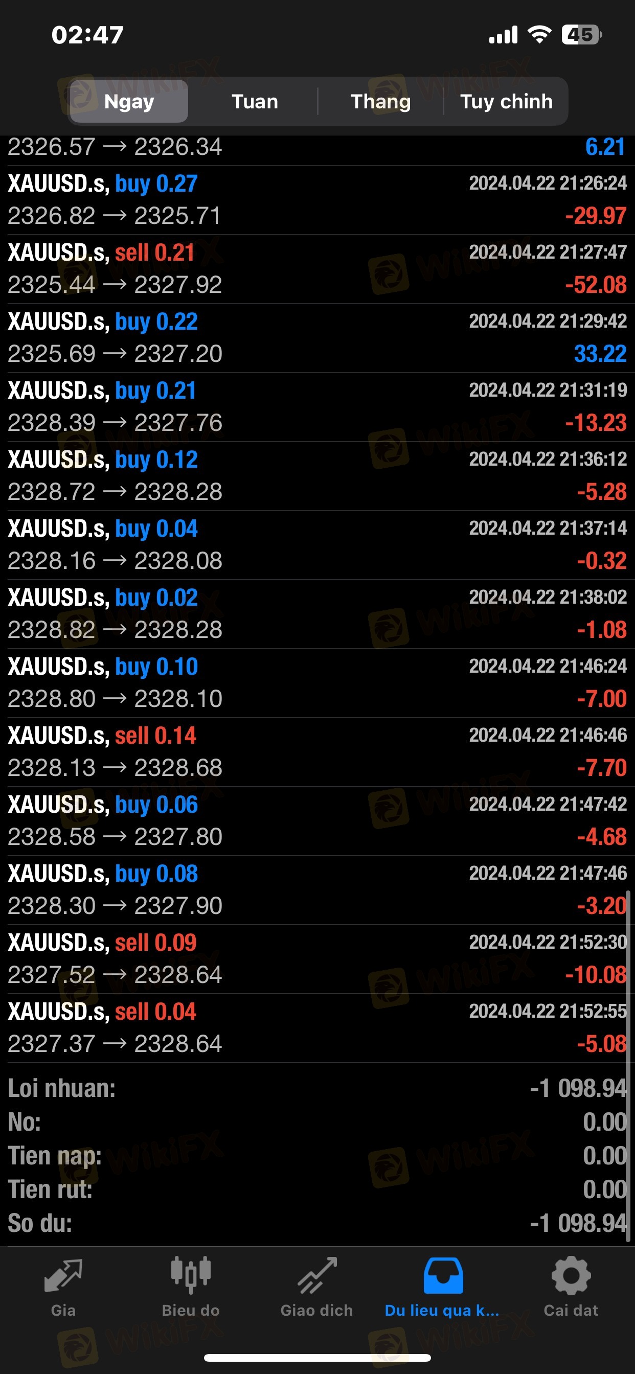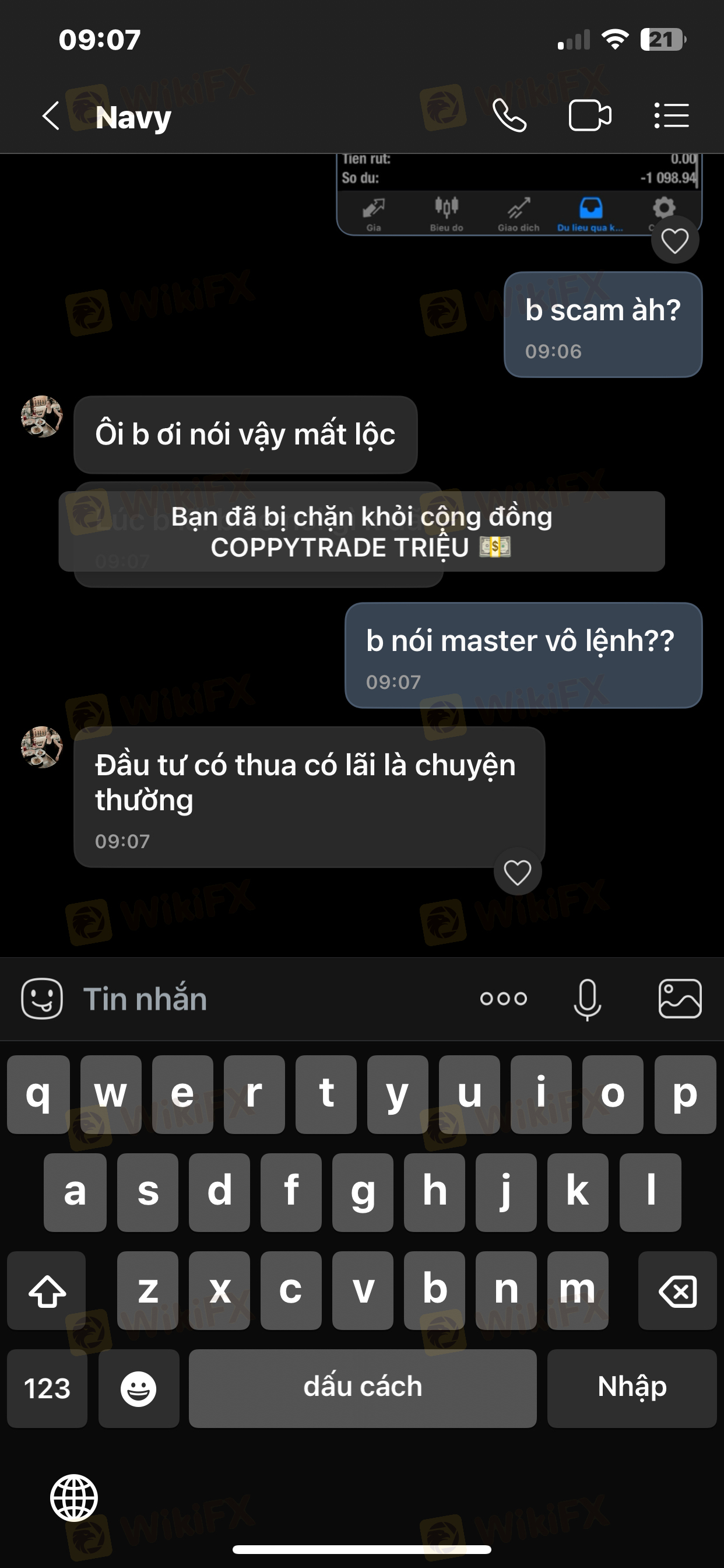Tiếp theo là khuya hôm đó Master cố tình đánh nhồi lệnh TK mình. Mình nhấn mạnh cố tình vì SP có thể xem thời gian vô lệnh (1phút đặt 5lot). Mình có liên lạc với master khuya hôm đó và không nhận được phản hồi, đến qua sáng hôm sau ngày 23/4. Master đã phản hồi với 1 câu là vì mình rút vốn và master ko đồng ý và sau đó đã chặn mình.