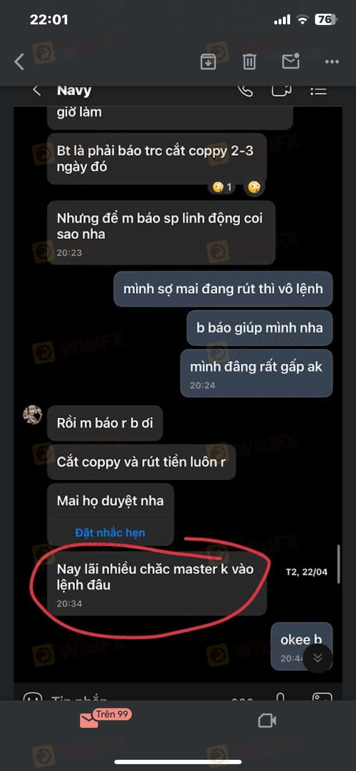 Sau khi copy của Master 635814 được vài ngày bên sàn Lion. Thì ngày 22/4 mình có thông báo với master mình muốn rút và tắt copy vì có việc đột xuất cần sử dụng vốn. Master đã phản hồi và đồng ý (Mình xin up ảnh dưới đây)