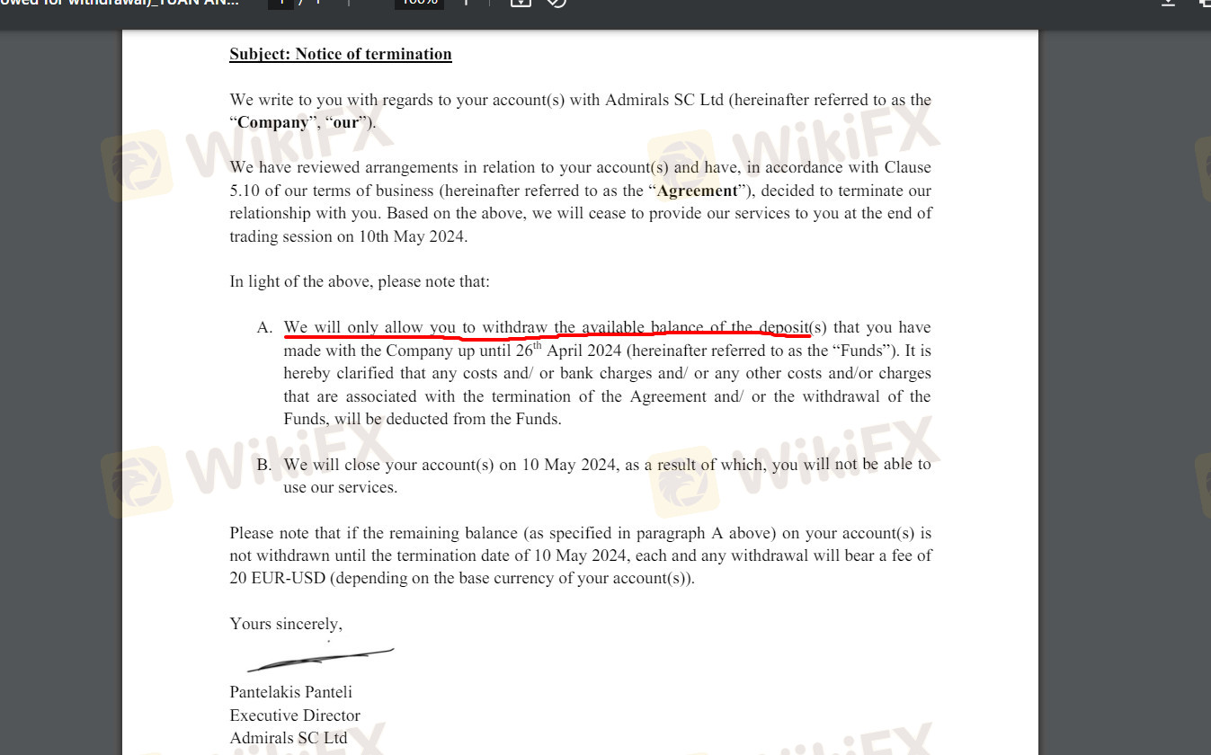 Tôi giao dịch sàn Admiral được 1 tháng qua sự giới thiệu từ một người bạn, mọi chuyển rất bình thường và tôi khẳng định mình không sử dụng bất cứ loại ưu đãi nào của sàn này cả, sau một thời gian nhận thấy tôi giao dịch lợi nhuận cao, bọn chúng bắt đầu làm trò, chúng chuyển tài khoản của tôi vào dạng chỉ cho đóng lệnh, sau đó vào ngày 26/4 bọn chúng tiến hành gửi email là sẽ đóng tài khoản của tôi và chỉ cho tôi rút số tiền nạp vào mà không cho rút bất cứ khoản lời nào cả, tôi đã yêu cầu bằng chứng về bất cứ điều gì tôi làm sai để mà bọn chúng có thể hành động vô lý đến như thế, nhưng vẫn chưa có bất cứ lời giải thích nào cả, tất cả tôi nhận được chỉ là 1 luật lệ chung chung của bọn chúng, Tôi đang bị bọn chúng lừa đảo và chiếm đoạt số tiền lên tới 9000 USD. Cảnh báo tới các nhà đầu tư hãy dừng giao dịch và tránh xa bọn lừa đảo này ra vì một khi bạn có lời bọn chúng sẽ ngay lập tức ăn cướp số tiền đó. Tôi khẳng định tôi không vi phạm bất cứ lỗi giao dịch sai trái nào như chúng nó đang cáo buộc, nếu chúng nó có bất cứ bằng chứng nào thể hiện tôi làm sai thì tôi chấp nhận mọi hình thức xử phạt.
