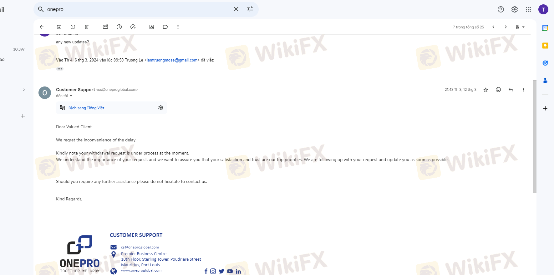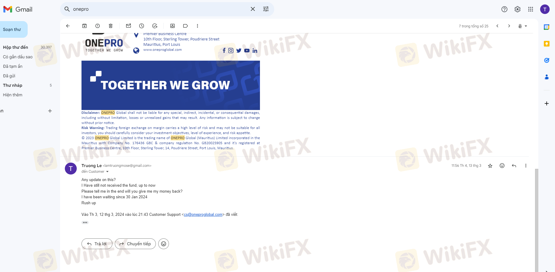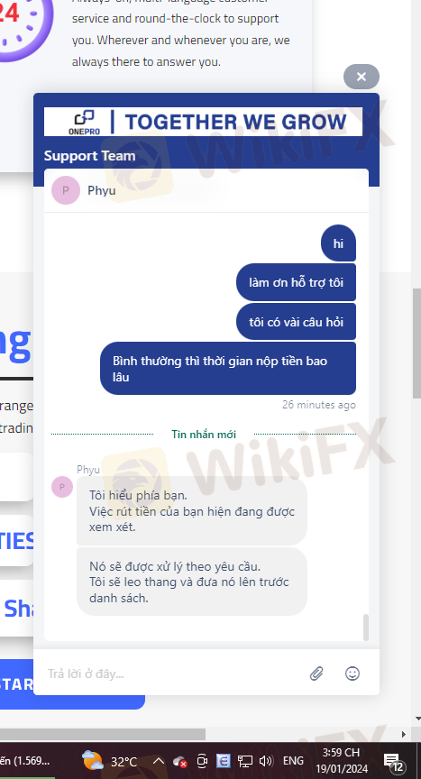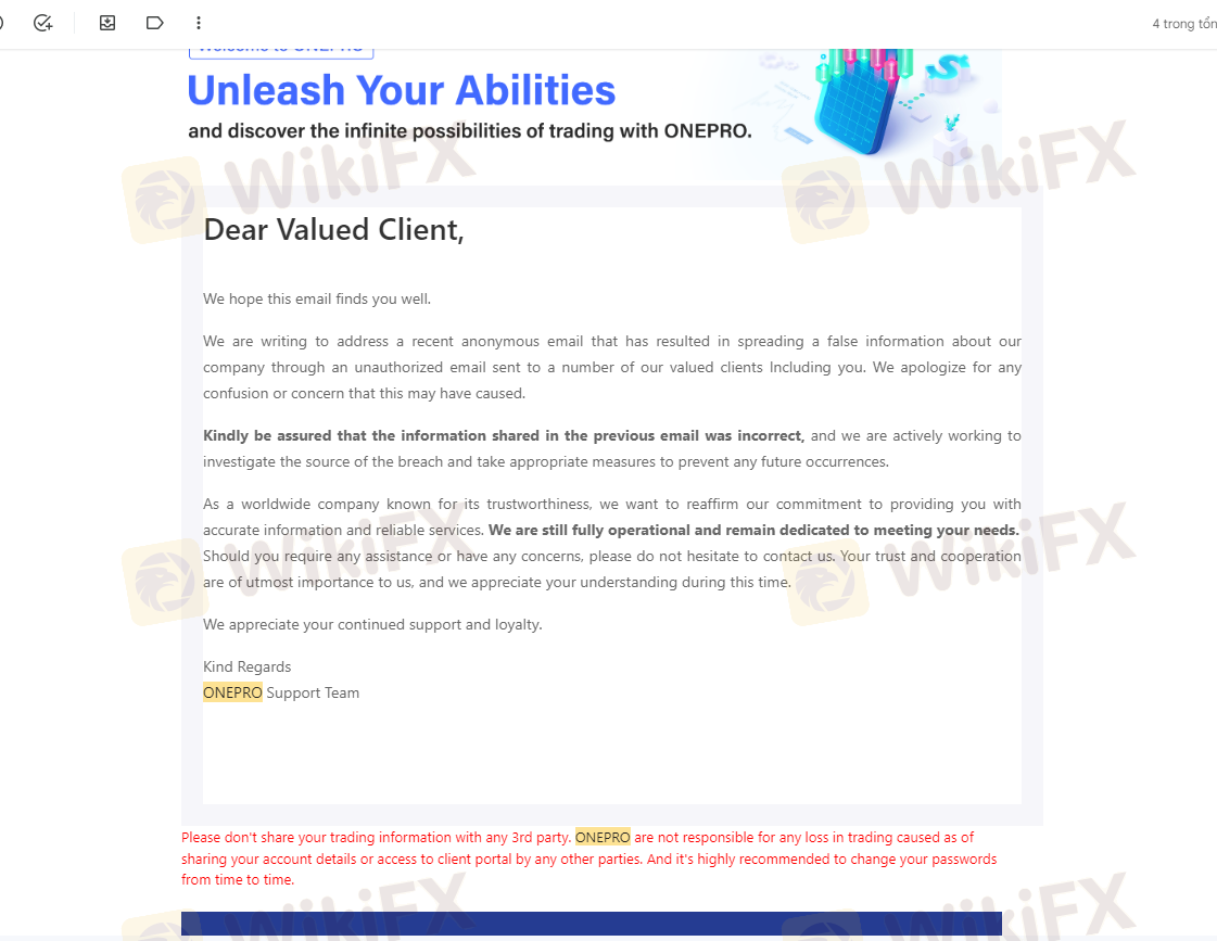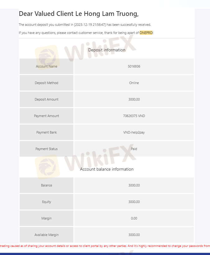 Ngày 19/12/2023 tôi có nộp số tiền 3000$ vào tài khoản giao dịch, sau 1 tháng giao dịch sinh lợi nhuận tôi có làm lệnh rút tiền 1000$ đầu tiên vào ngày 29/01/2024 nhưng tài khoản ngân hàng của tôi không nhận được số tiền đó. trong khi nó đã trừ vào tk giao dịch của tôi và thông báo đã thành công nhưng không nhận được. Sàn Onepro cố ý tạo lịch sử giả để chiếm đoạt số tiền của tôi và sau nhiều lần liên hệ cố gắng kéo dài thời gian và sau đó mất tích. Phi vụ lừa đảo trắng trợn và số tiền vốn 3000$ vẫn chưa được rút. Live chat thì không thấy hoạt động và không có support hỗ trợ. Tôi muốn lấy lại 3000$ của tôi
