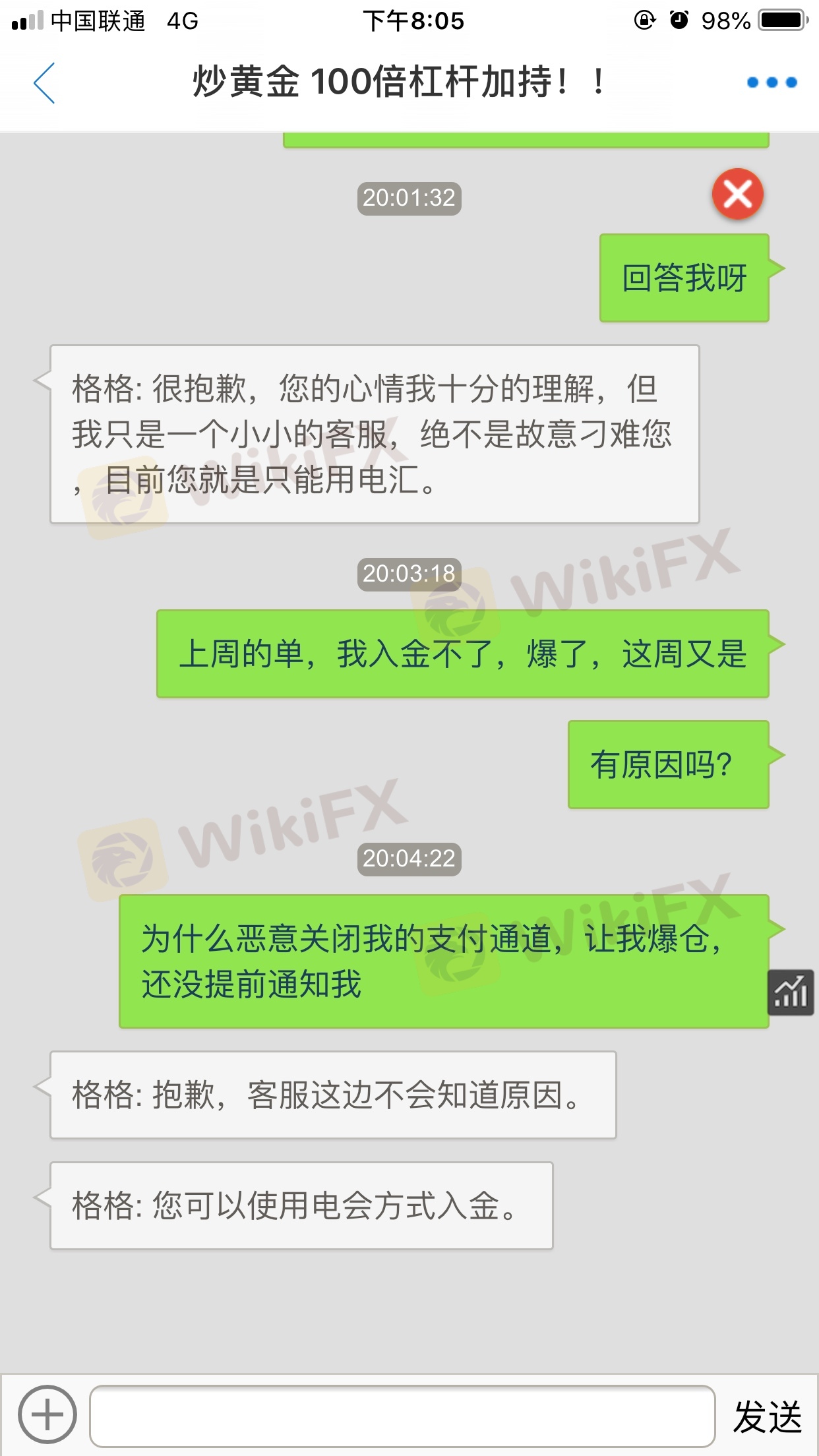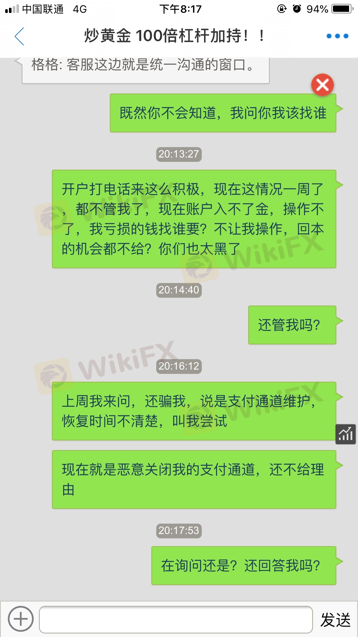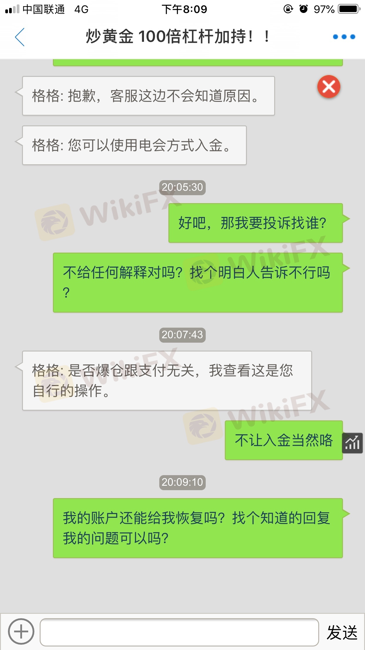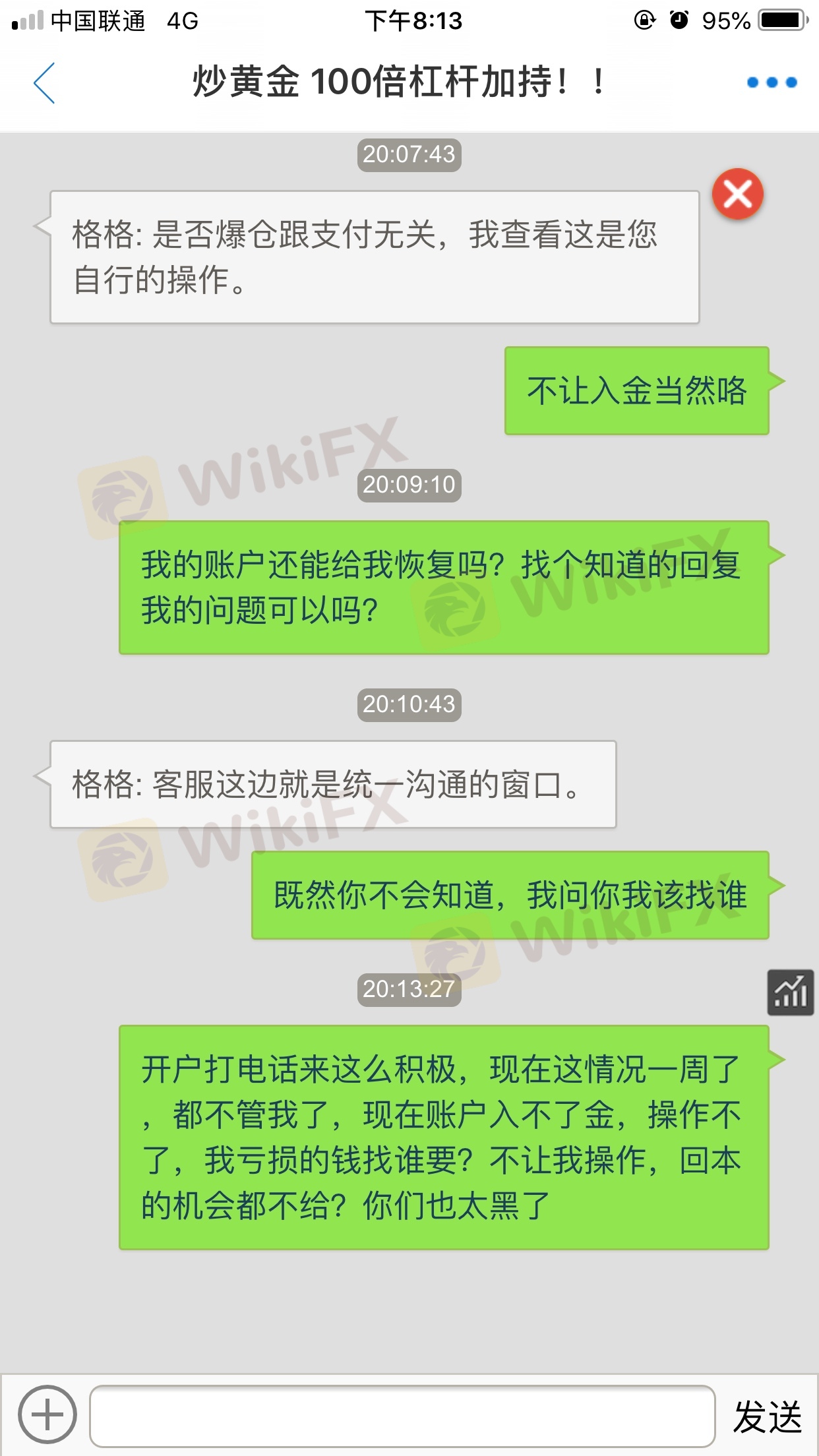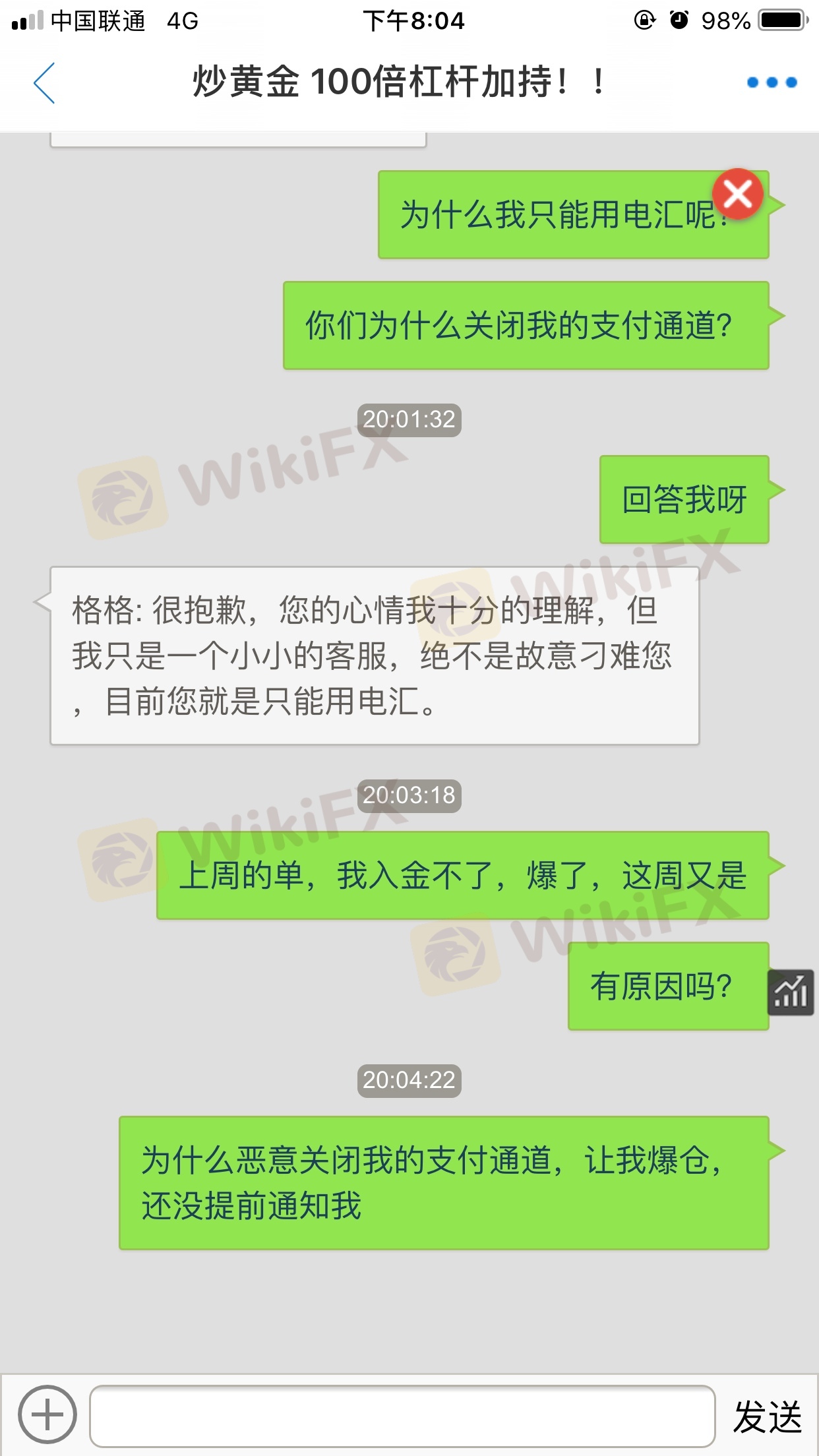 我于2018年10月30日在行情软件看见创富金融黑平台的广告,开户进行交易,开始几天交易都是正常的,还少有盈利出金2000美金。后来他们调低黄金保证金比例,诱导客户重仓操作。11月8号,他们后台看我仓位较重,就恶意关闭了我的入金通道,只剩下一个电汇的入金方式,迫不得已我只能进行了锁仓,因为入金不了,两天时间,无法解锁仓位,导致系统强行平仓,本金损失殆尽。询问客服百般抵赖,开始说支付通道合作商在维护,叫我随后尝试。又说没有不让我入金,叫我银行电汇,3-5工作日才能到账。今天我以开户的名义询问一个没见过的新客服,才问出来,就是恶意关闭我账户的支付通道,恶意造成客户亏损。吃头寸。黑平台黑到无法理喻。不赔偿我的亏损,我维权到底。