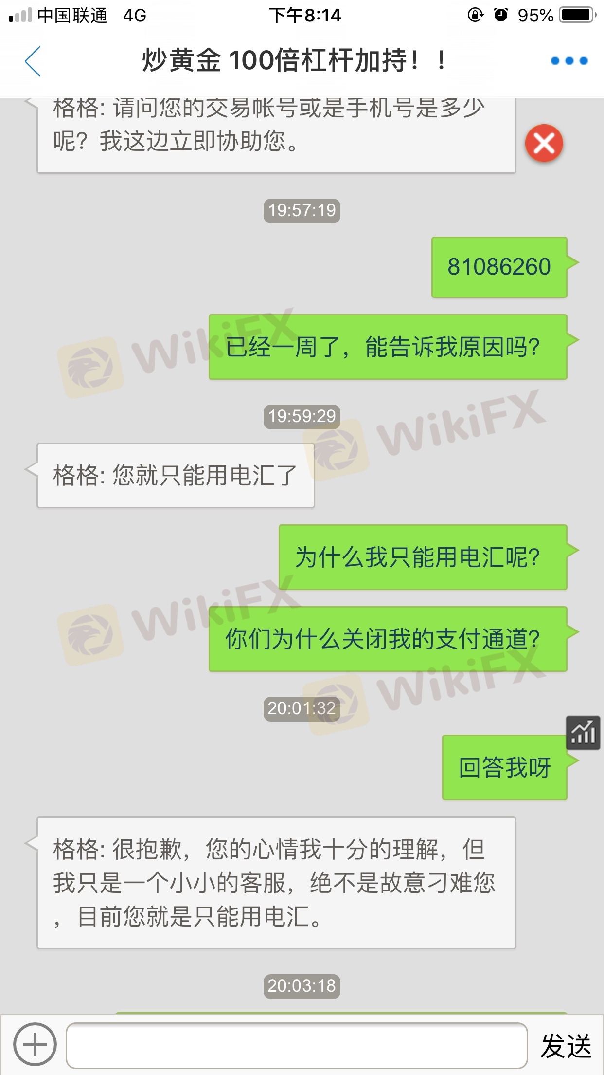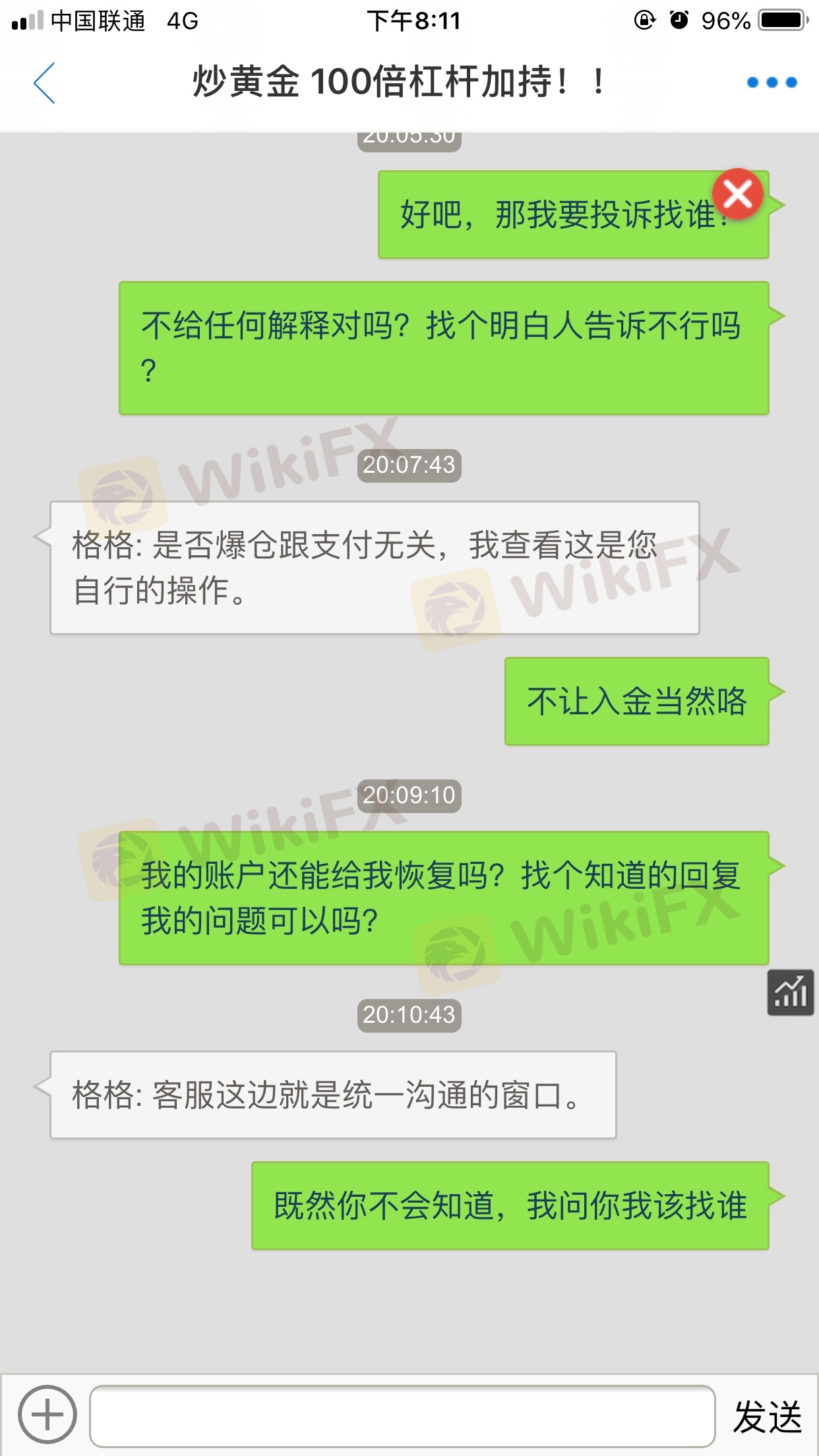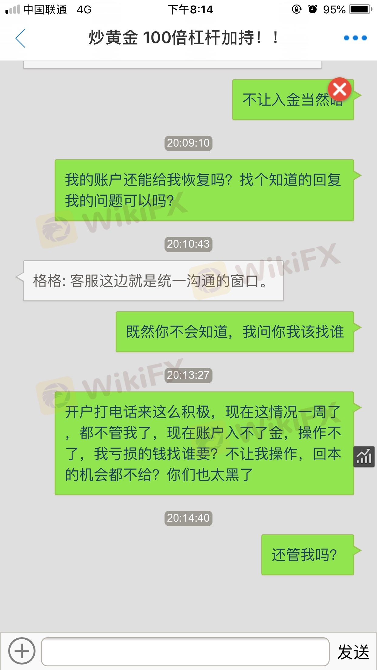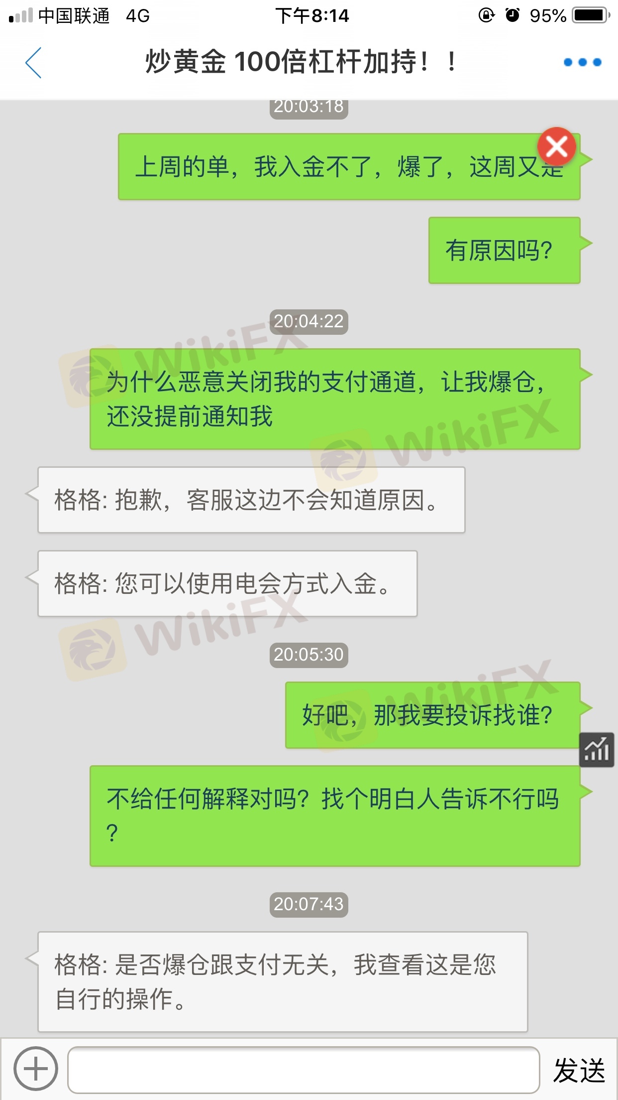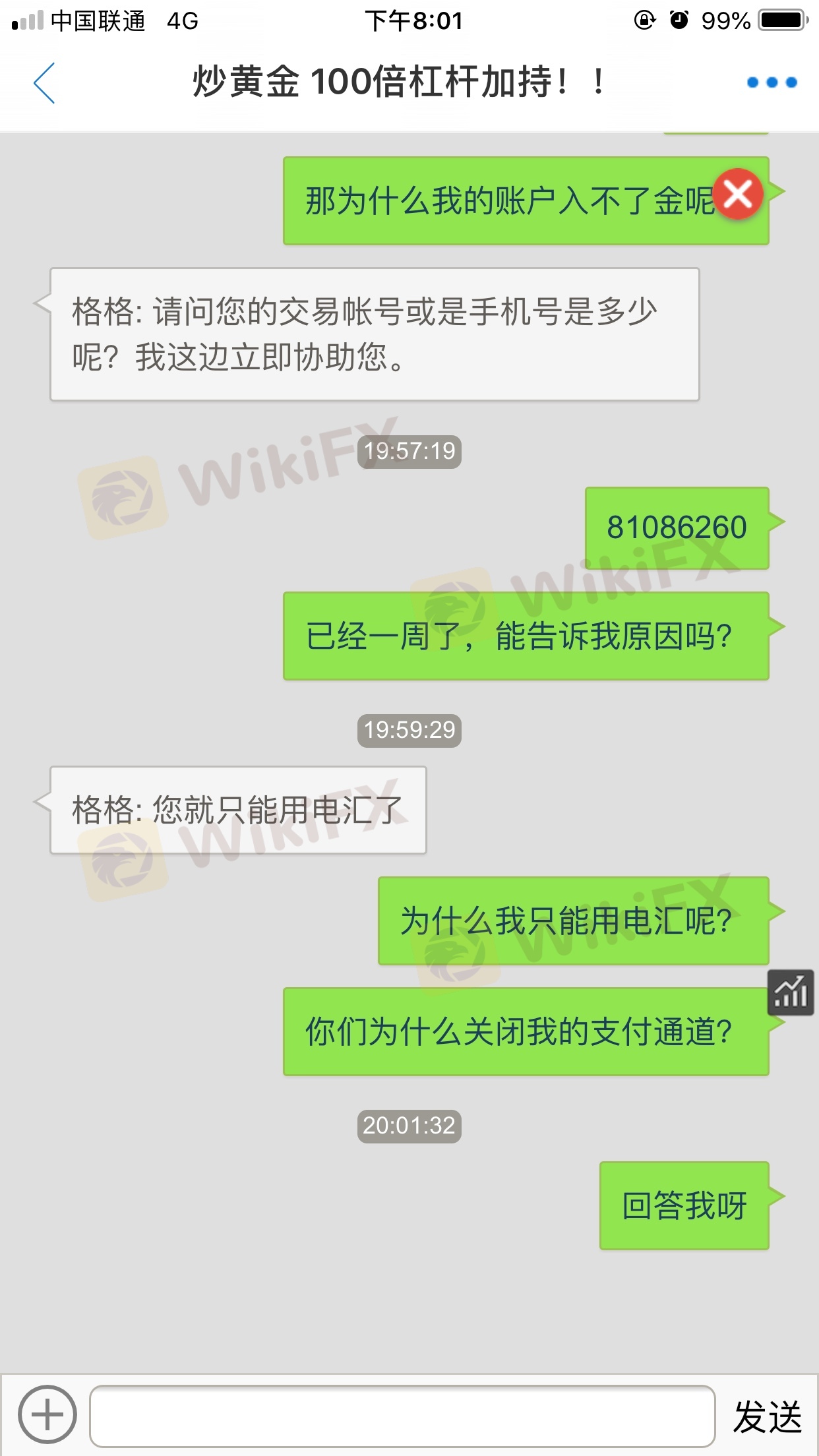 我于2018年10月30日在行情软件看见创富金融黑平台的广告,开户进行交易,开始几天交易都是正常的,还少有盈利出金2000美金。后来他们调低黄金保证金比例,诱导客户重仓操作。11月8号,他们后台看我仓位较重,就恶意关闭了我的入金通道,只剩下一个电汇的入金方式,迫不得已我只能进行了锁仓,因为入金不了,两天时间,无法解锁仓位,导致系统强行平仓,本金损失殆尽。询问客服百般抵赖,开始说支付通道合作商在维护,叫我随后尝试。又说没有不让我入金,叫我银行电汇,3-5工作日才能到账。今天我以开户的名义询问一个没见过的新客服,才问出来,就是恶意关闭我账户的支付通道,恶意造成客户亏损。吃头寸。黑平台黑到无法理喻。不赔偿我的亏损,我维权到底。